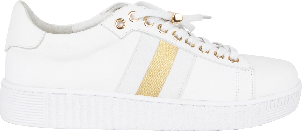 - Color Scheme: The primary color is crisp white, with striking gold accents, including a metallic gold stripe on the side and gold-tone metal eyelets.