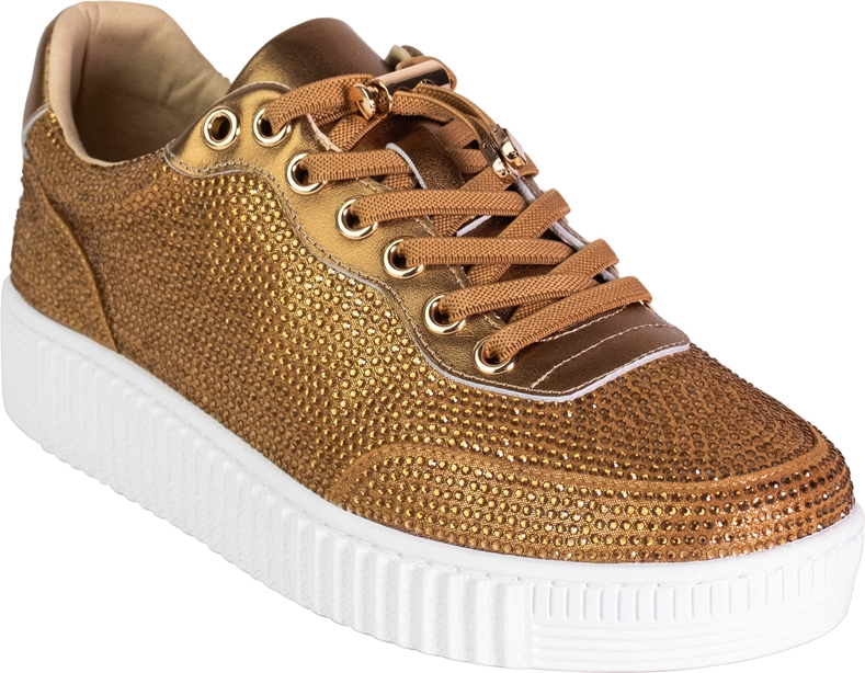 Step into radiant style with the Bromlee Sneaker , a dazzling blend of sporty comfort and glamorous sophistication. This sneaker is meticulously crafted to make a bold fashion statement while delivering everyday wearability. The upper is lavishly embellished with fine toned crystals that catch the light from every angle, creating a shimmering, jewel-like effect. Each crystal is precisely set against a smooth metallic base, giving the shoe a seamless and refined sparkle. The sneaker features sleek metallic overlays around the eyelets and lace guard, enhancing its luxurious appeal.