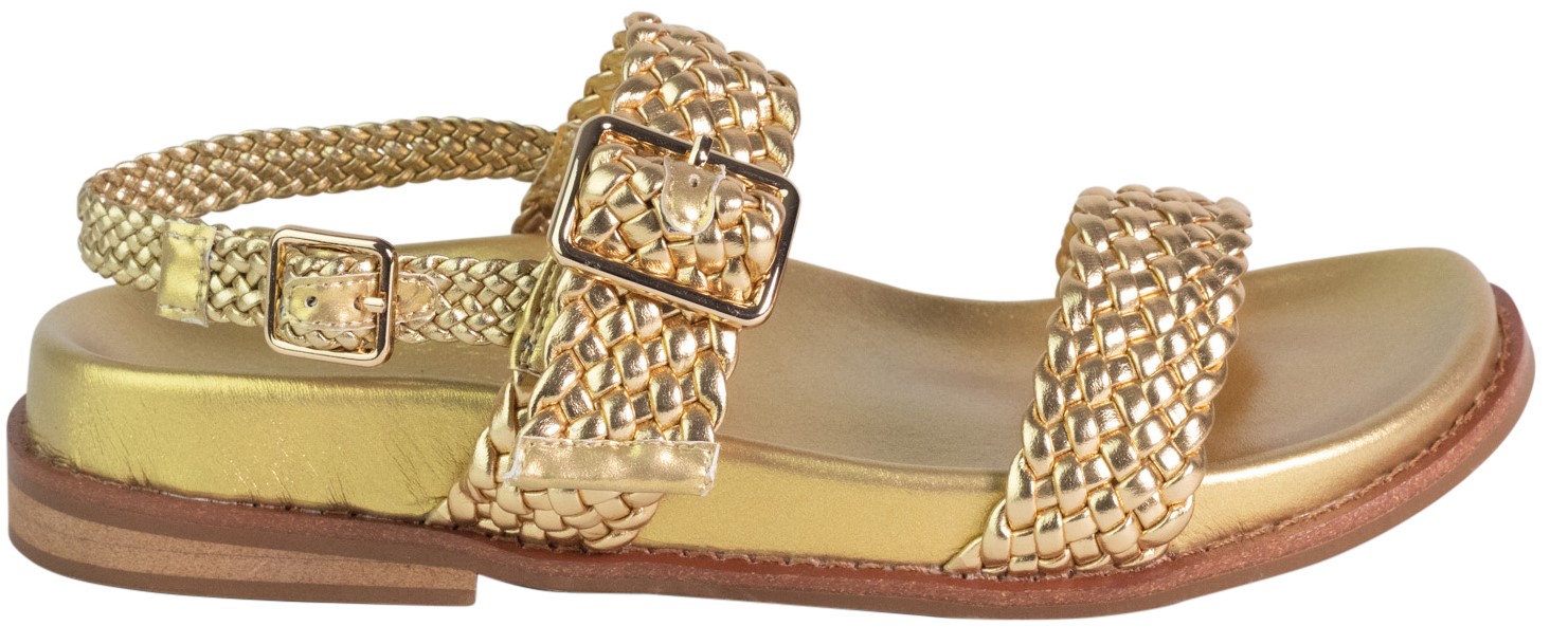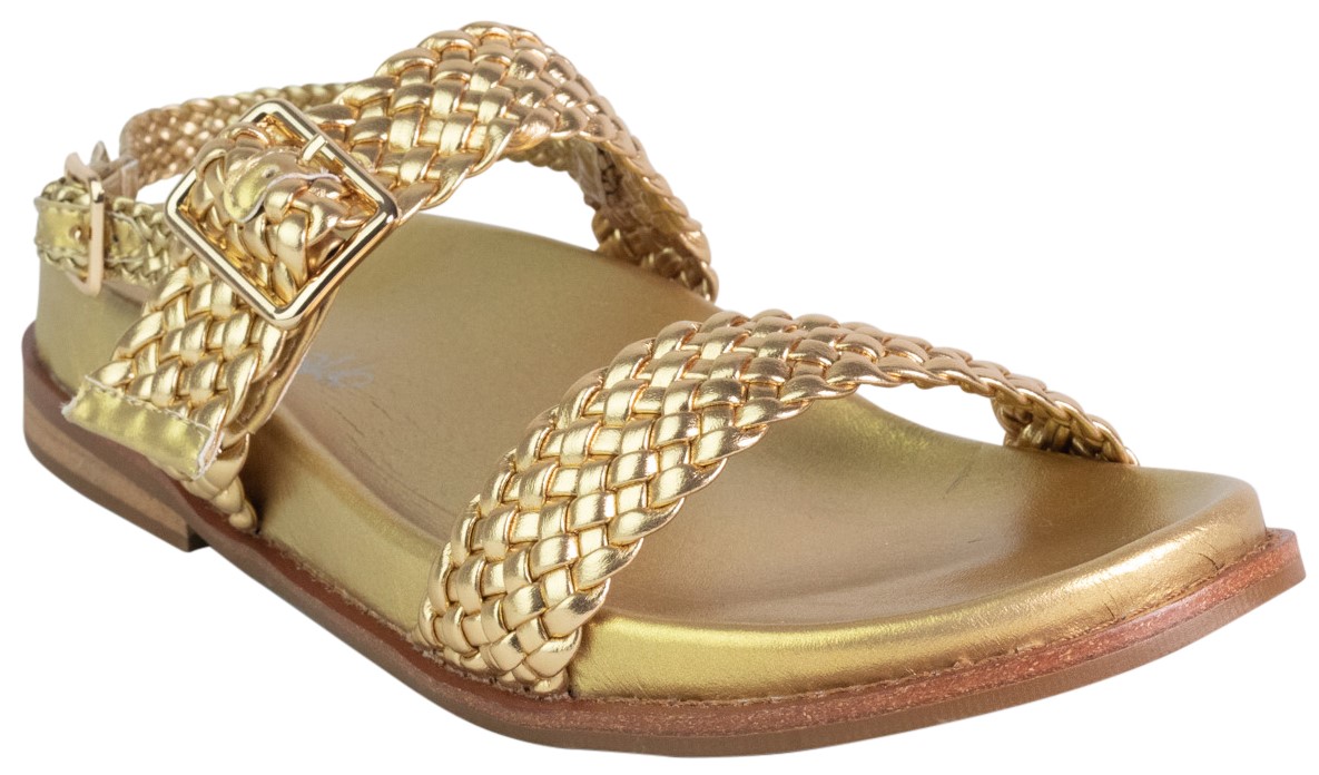 This is a stylish Eltham sandal featuring two wide braided premium leather straps—one over the toes and one at the ankle. It includes a gold-tone adjustable buckle on the ankle strap for a secure fit. The sandal sits on a flat sole, offering both comfort and a chic, versatile look perfect for casual wear.