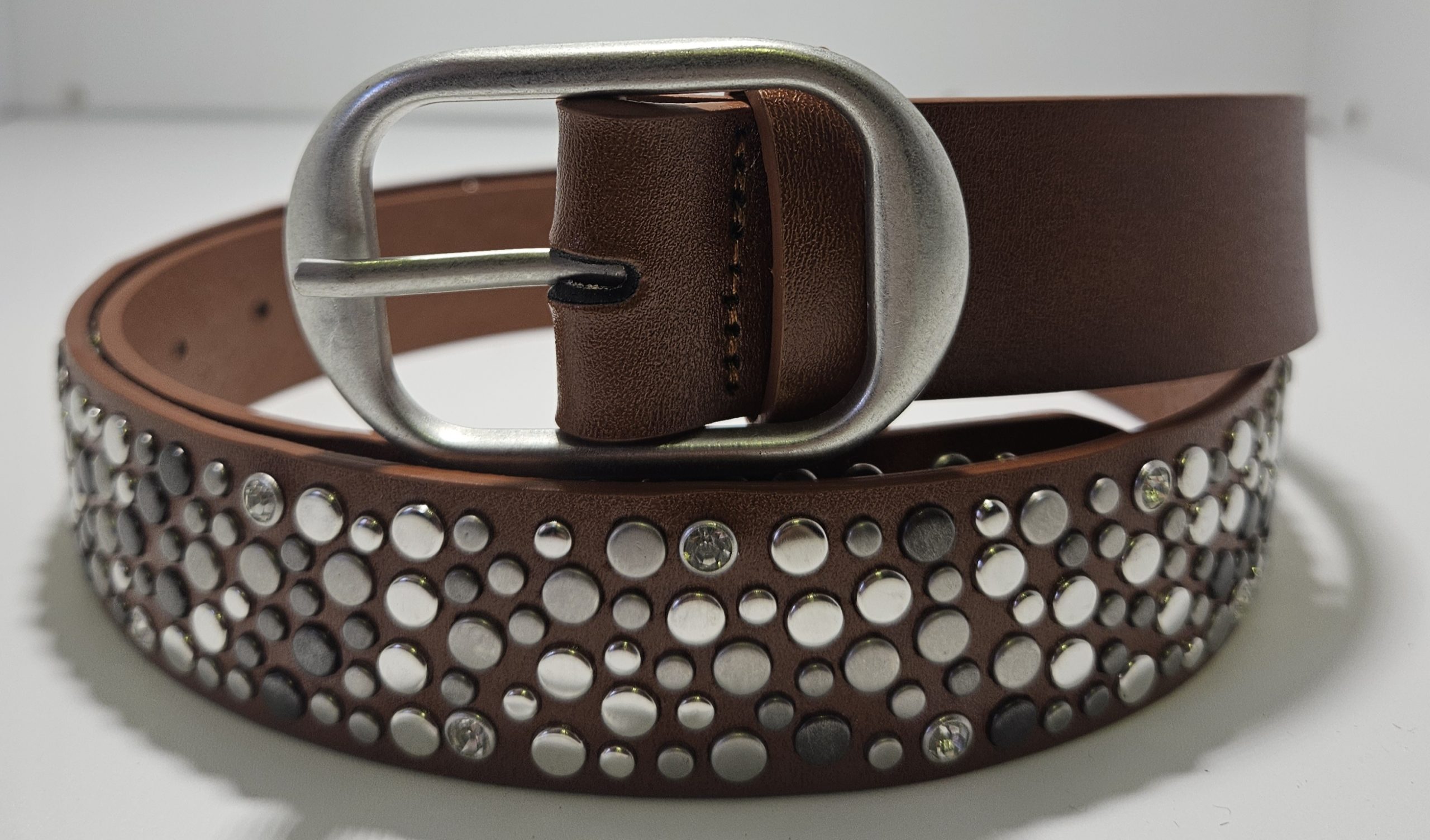 Elevate your wardrobe with this Flat Stud Belt, designed to add a bold touch of glamour to any outfit. Crafted from high-quality leather with a metallic crackle finish, the belt exudes a modern, edgy vibe while maintaining a versatile appeal.