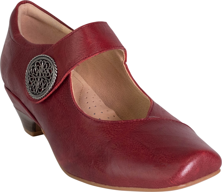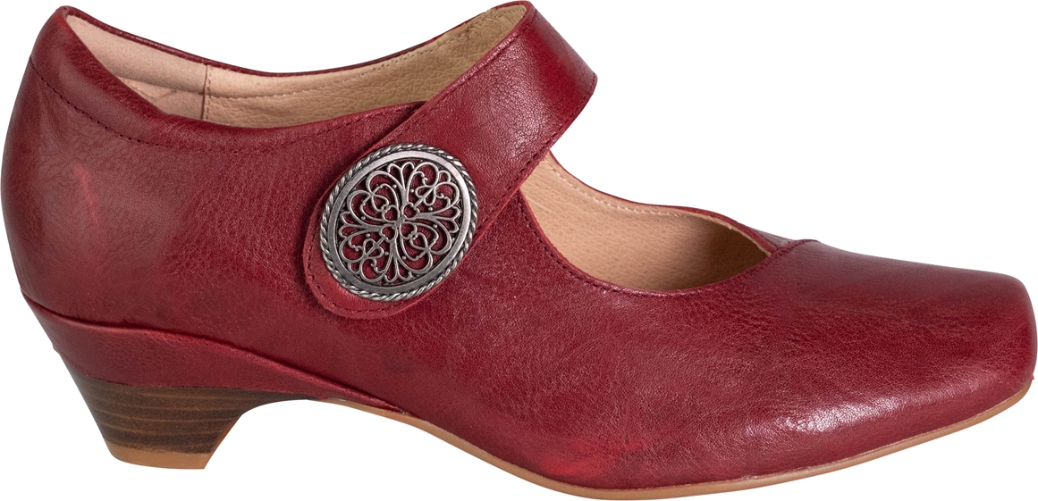 The rounded toe creates a balanced, feminine silhouette, while the secure instep strap is accented with an ornate antique-silver medallion buckle, adding a subtle vintage-inspired detail. The strap provides a comfortable, adjustable fit, ensuring stability throughout the day.