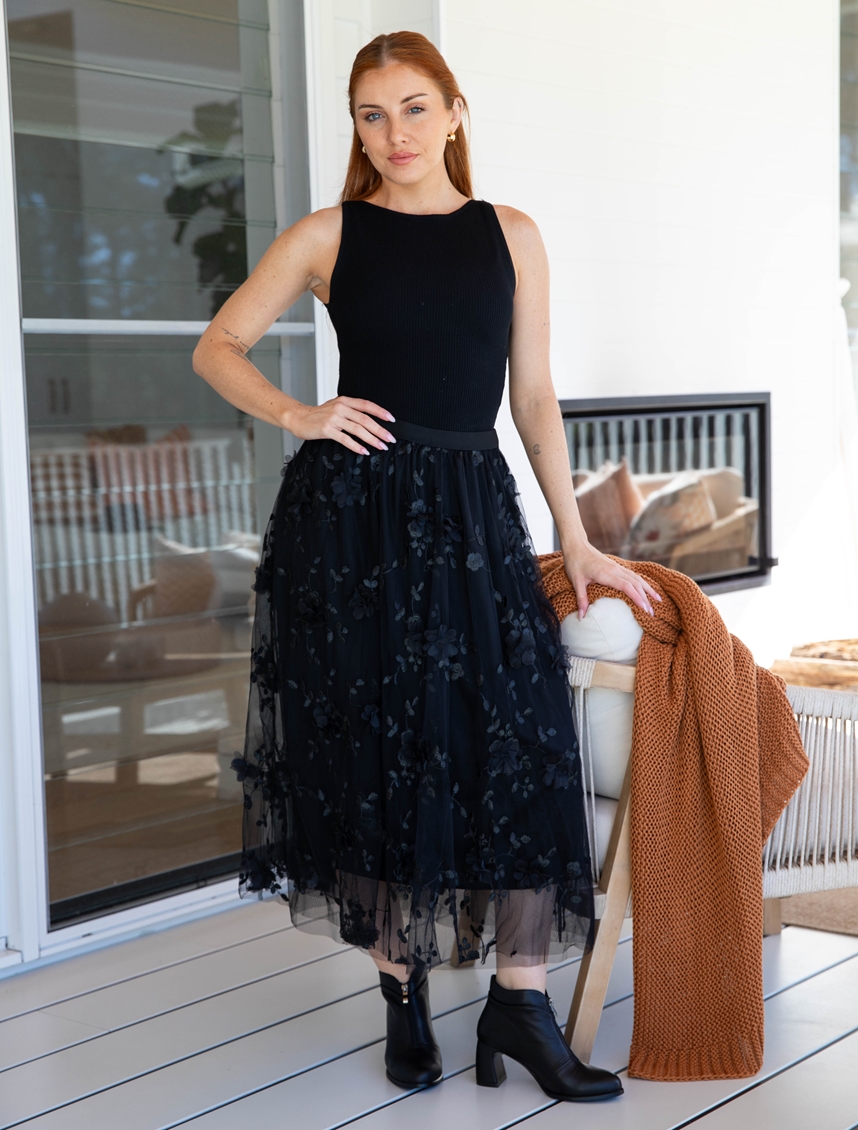 Designed with a comfortable, fitted waistband, this skirt ensures a secure and flattering fit while allowing easy pairing with everything from sleek camis and fitted tops to chunky knits and tailored blazers. The inner lining provides full coverage, while the outer tulle layer adds movement and a touch of drama to every step.
