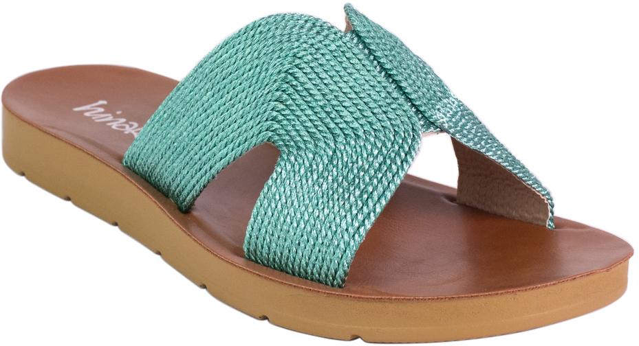 Upper: The sandal features a wide, woven textile upper crafted in a cross-band design. This textured material provides both visual interest and a flexible, breathable fit across the foot.
