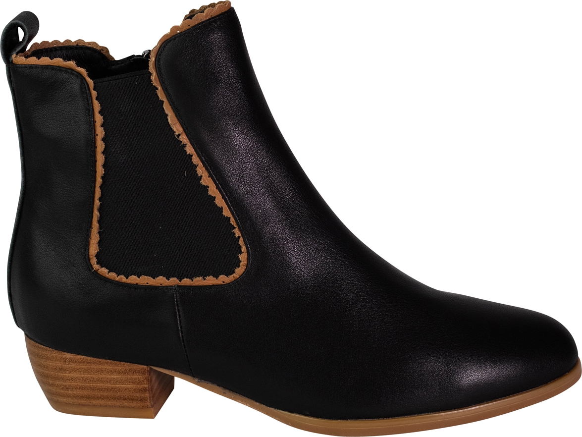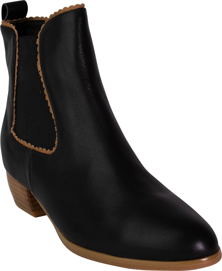 The boot features classic style elastic gussets on both sides for easy slip-on wear, framed by delicately scalloped trim in a contrasting tan tone—adding a touch of feminine detail and artisanal craftsmanship. The pull-tab at the back enhances practicality, allowing for quick on-and-off access without compromising style.
